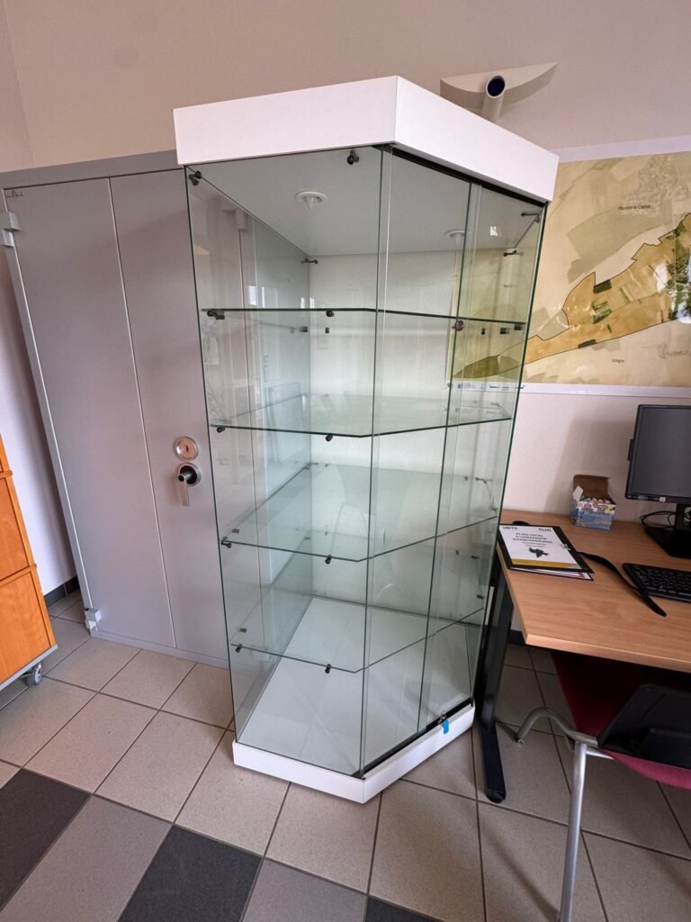 Vitrine éclairée sur roulettes en très bon état. Portes coulissantes avec clé. Hauteur : 180 cm. Largeur : 80 cm. Profondeur : 80 cm